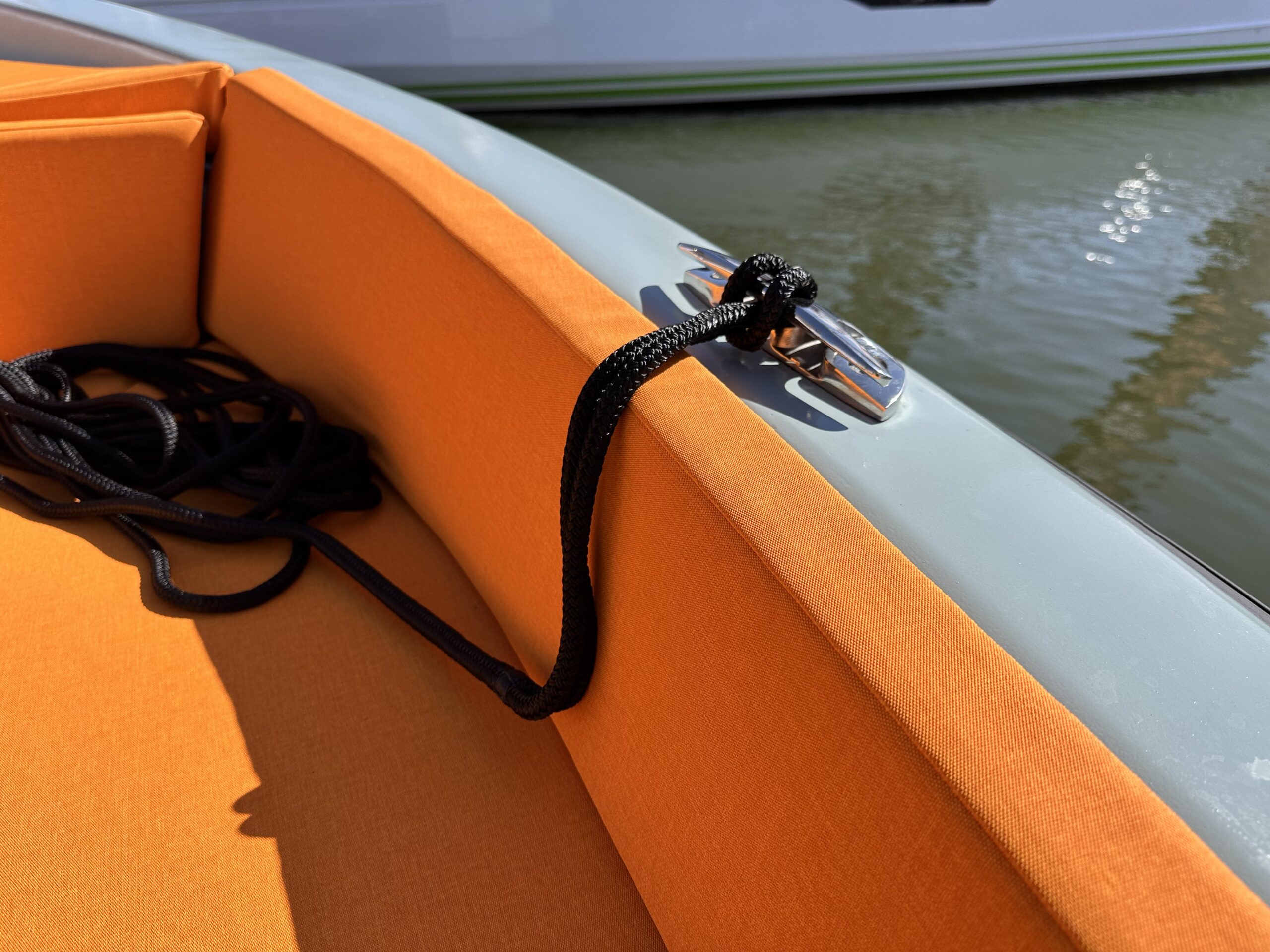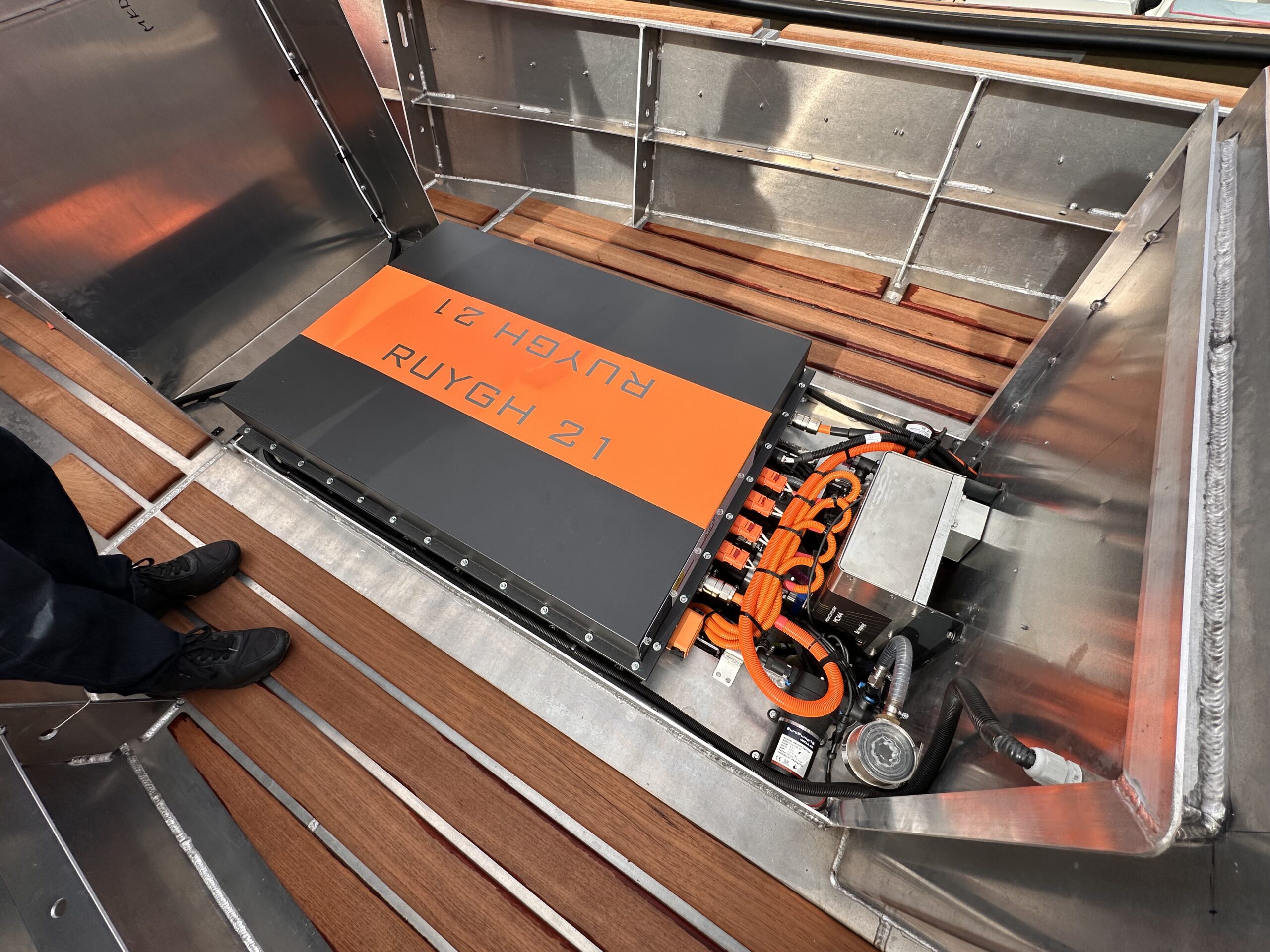 Another boat with a high cool factor and also the most fun to say is the electric work boat Ruygh 21, pronounced ‘row-ghh’. Built by the Ruys Jachtbouw shipyard, its made from marine grade aluminum and decked with wide cedar planks, and features a sturdy tow bar behind the helm console with solid cleats at the bow and stern.