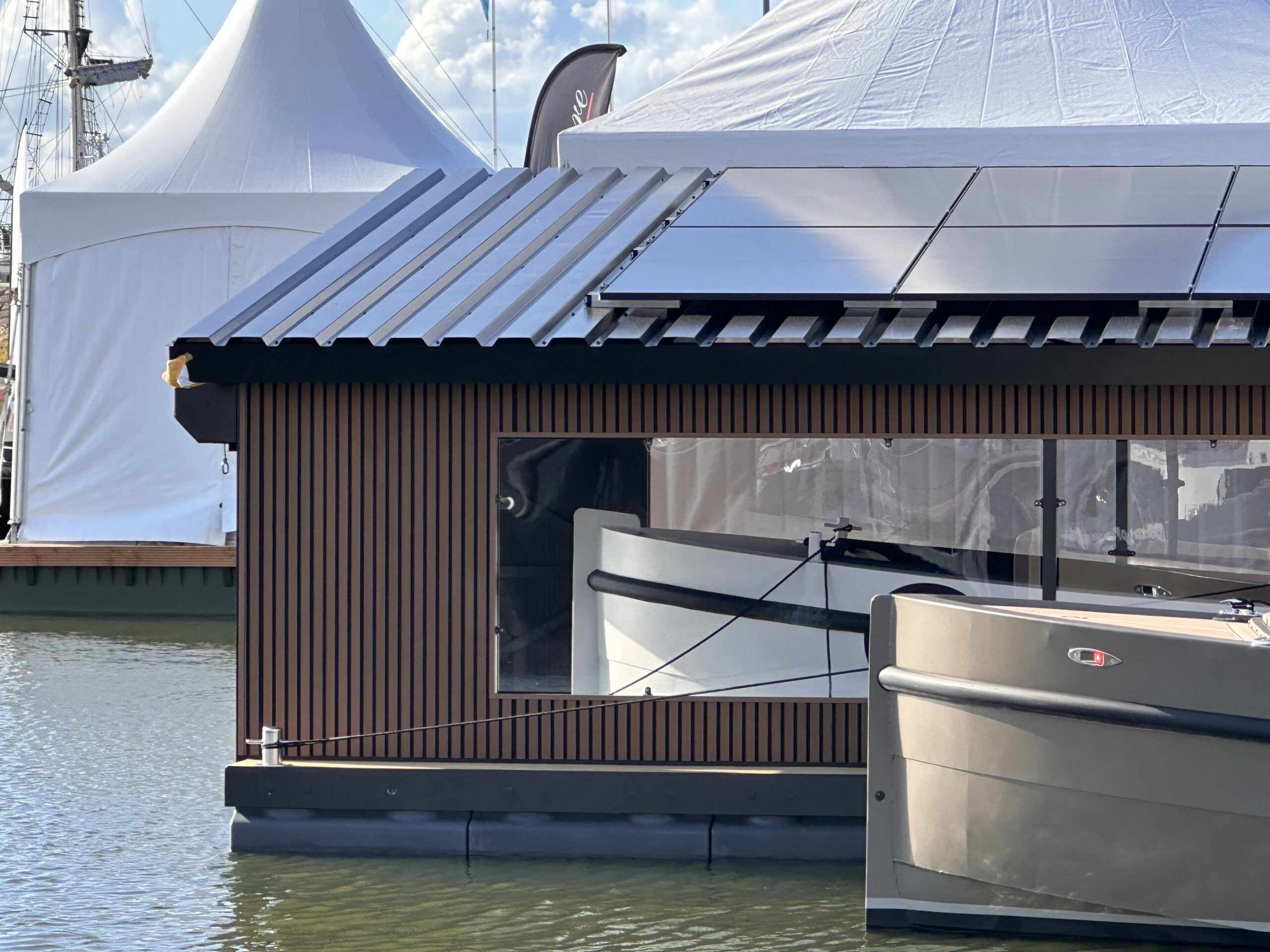 The most interesting display however, was their floating solar powered boat house, called Smart Dock. This aluminum structure, smartly finished in vertical wood facade and flexiteak flooring is fitted with 5400 watts of solar power, with big windows a remote garage door, enabling charging for an electric boat just about anywhere.